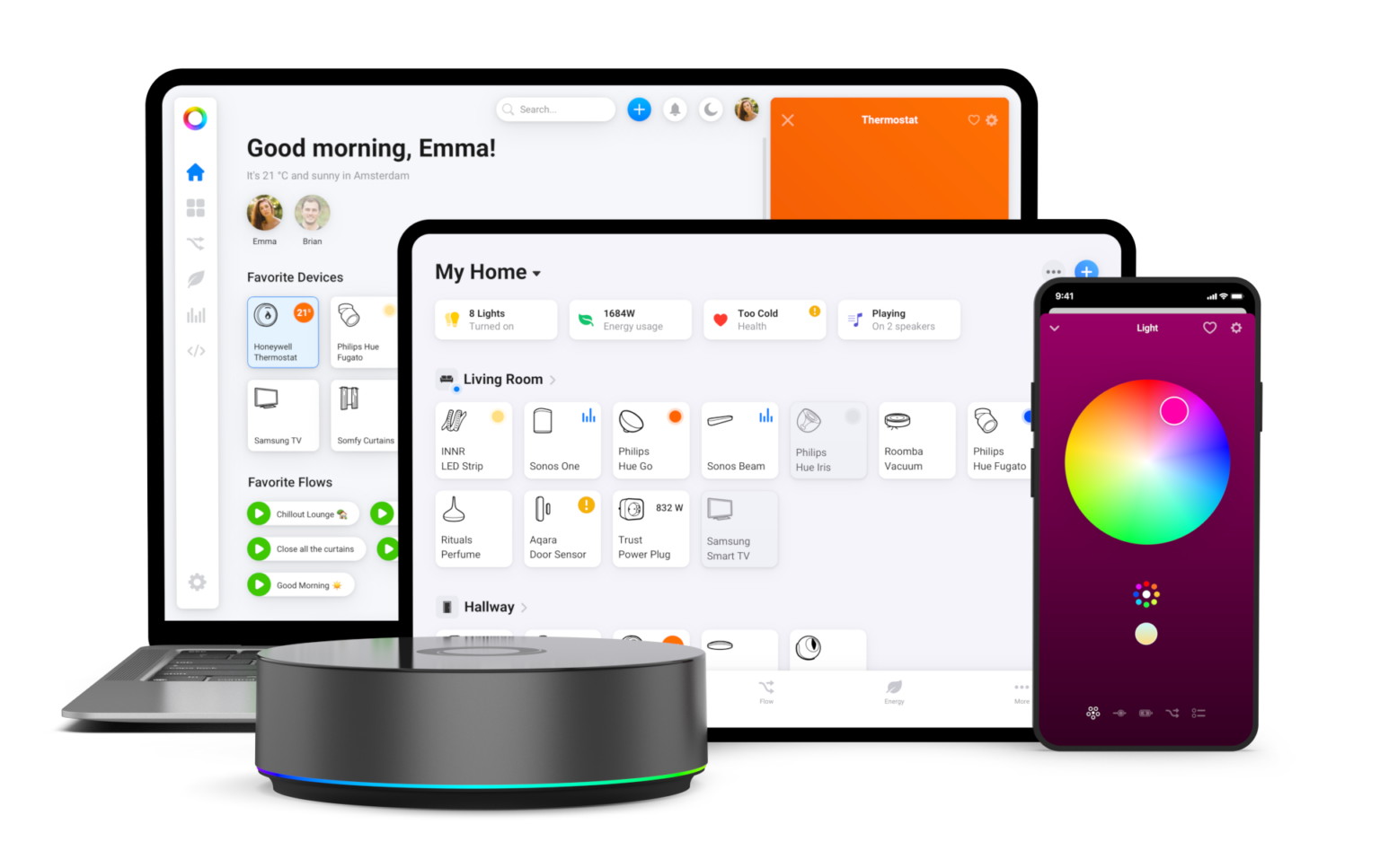 Hiermee worden al je apparaten beschikbaar in de Homey smartphone app - overal ter wereld! KNX apparaten worden in de Homey app direct gecombineerd met de andere slimme apparaten die Homey ondersteunt, in één overzicht. Ook kun je eenvoudig Flows maken om je huis hiermee te automatiseren.